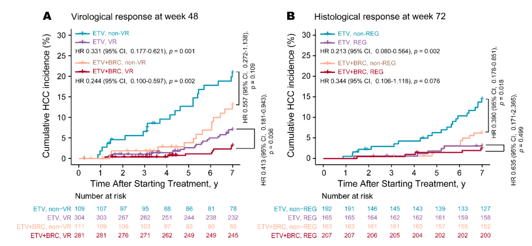 圖2. ETV+BRC組與ETV單藥組48周病毒學應答、72周組織學應答與肝癌累積發(fā)生率的相關性